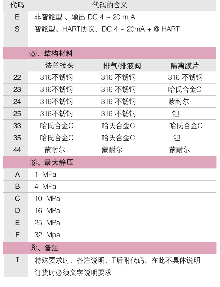 隔離膜片:316L不銹鋼,哈氏合金C、 蒙耐爾或  鉭