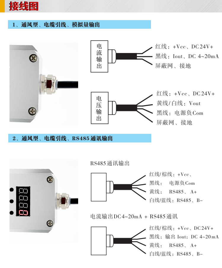 2、標準的4~20 m A輸出、電壓0~5V/1~5/0~10V等標準的電纜連接輸出接線方式完全同標準型的