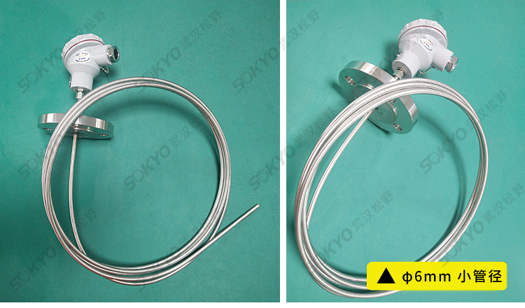 武漢松野的鎧裝式結構溫度變送溫度傳感器在尺寸和材質上均支持定制化設計。溫度傳感器的溫度外管直徑可根據用戶需求進行定制,當選用φ為6mm的小管徑時,外管可軟彎成盤管,便于在狹小空間內進行安裝。此外,還可定制加厚管壁以提升耐磨性能,或把傳感器前端做成尖狀,直接插入使用,以滿足特殊環境下的測溫需求。