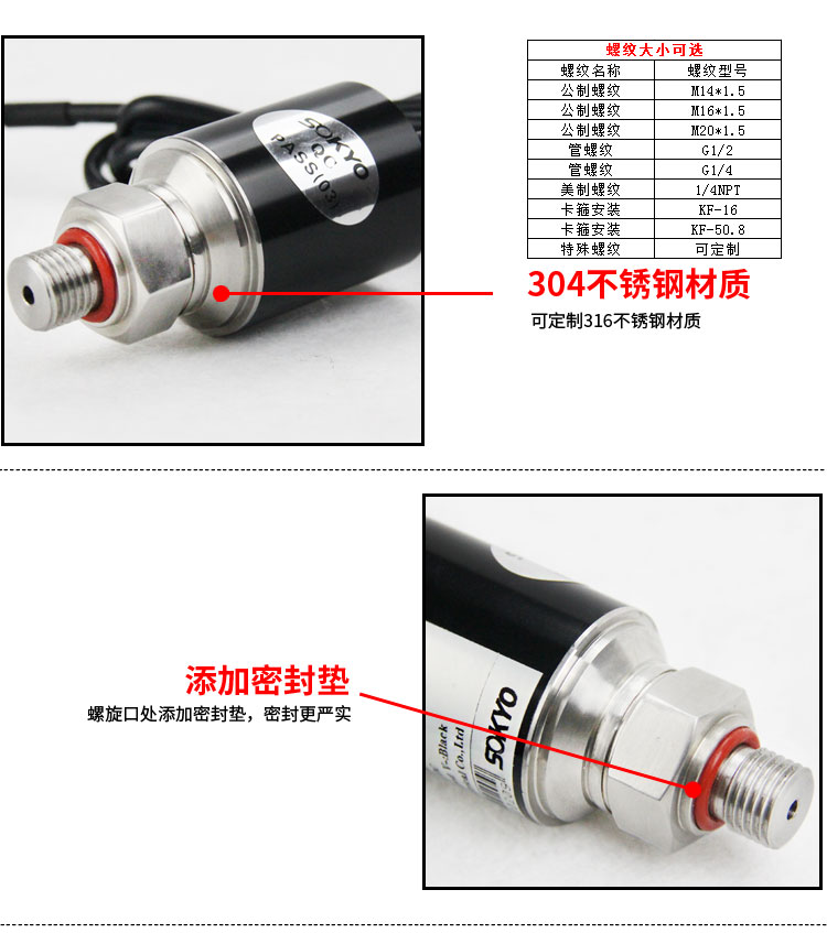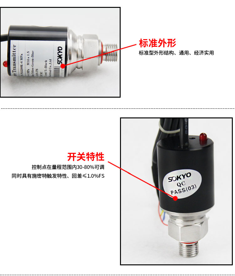 2、全不銹鋼、體積小巧、安裝方便、接線簡單、開關動作點可以任意調整、回差固定≤ 1.0 % FS